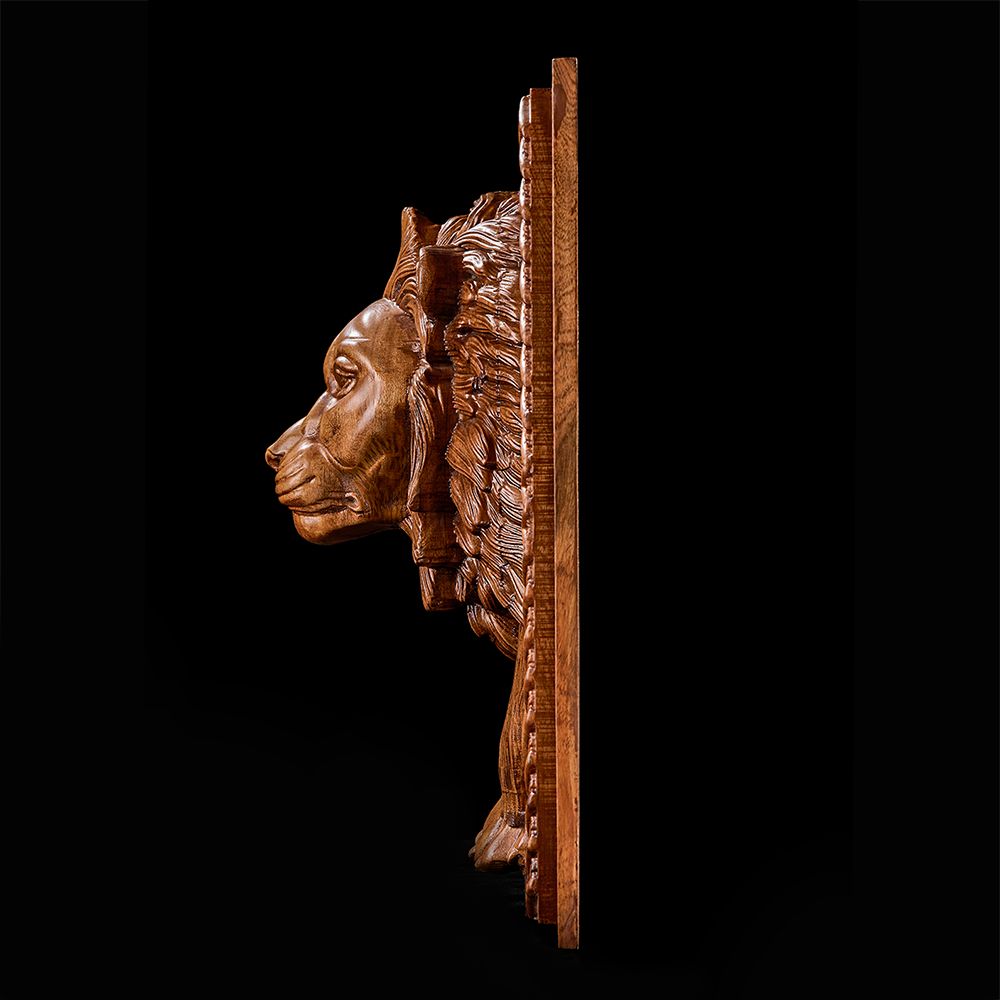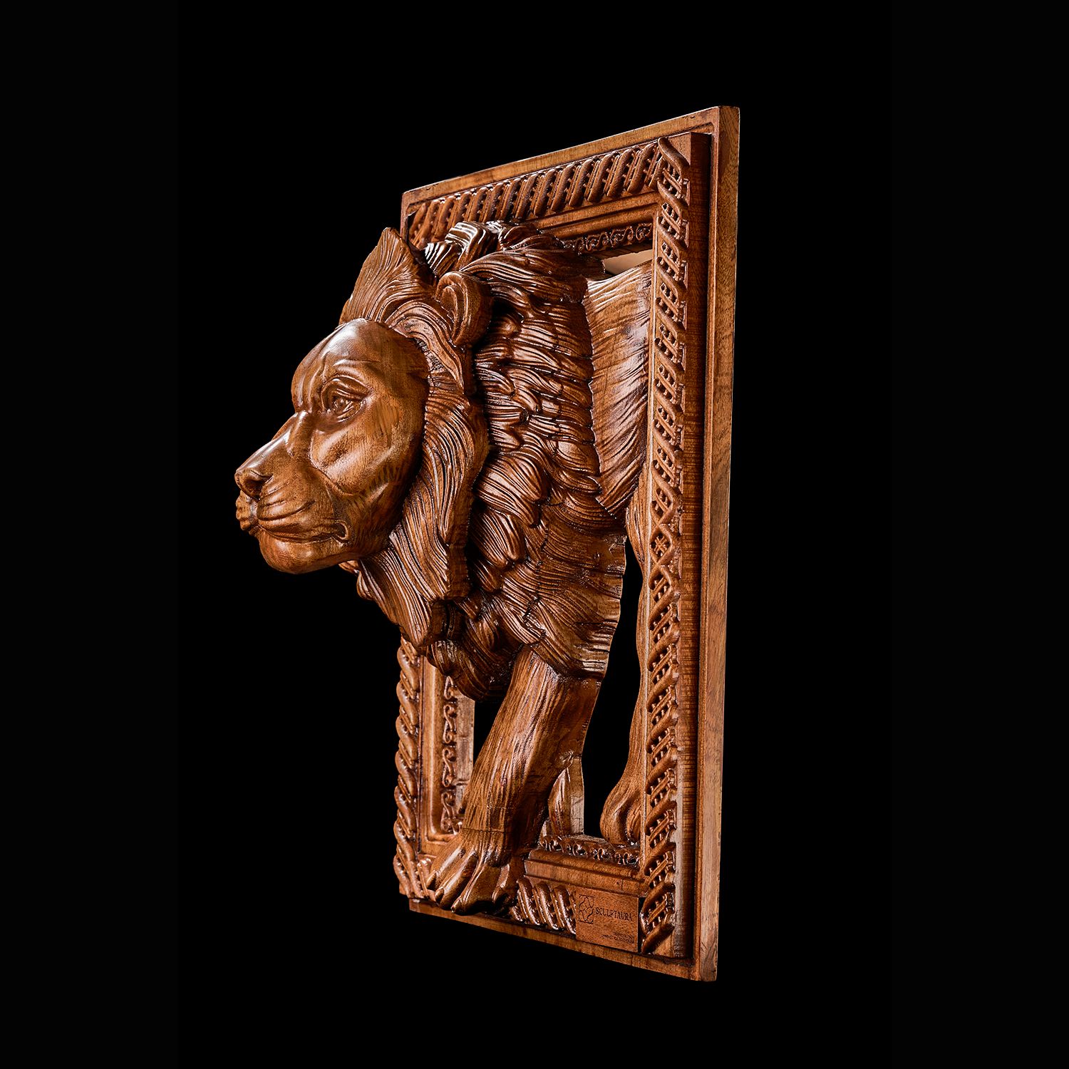 A powerful lion steps beyond its boundary, symbolizing strength that cannot be contained. A hand-carved masterpiece blending depth, realism, and authority.