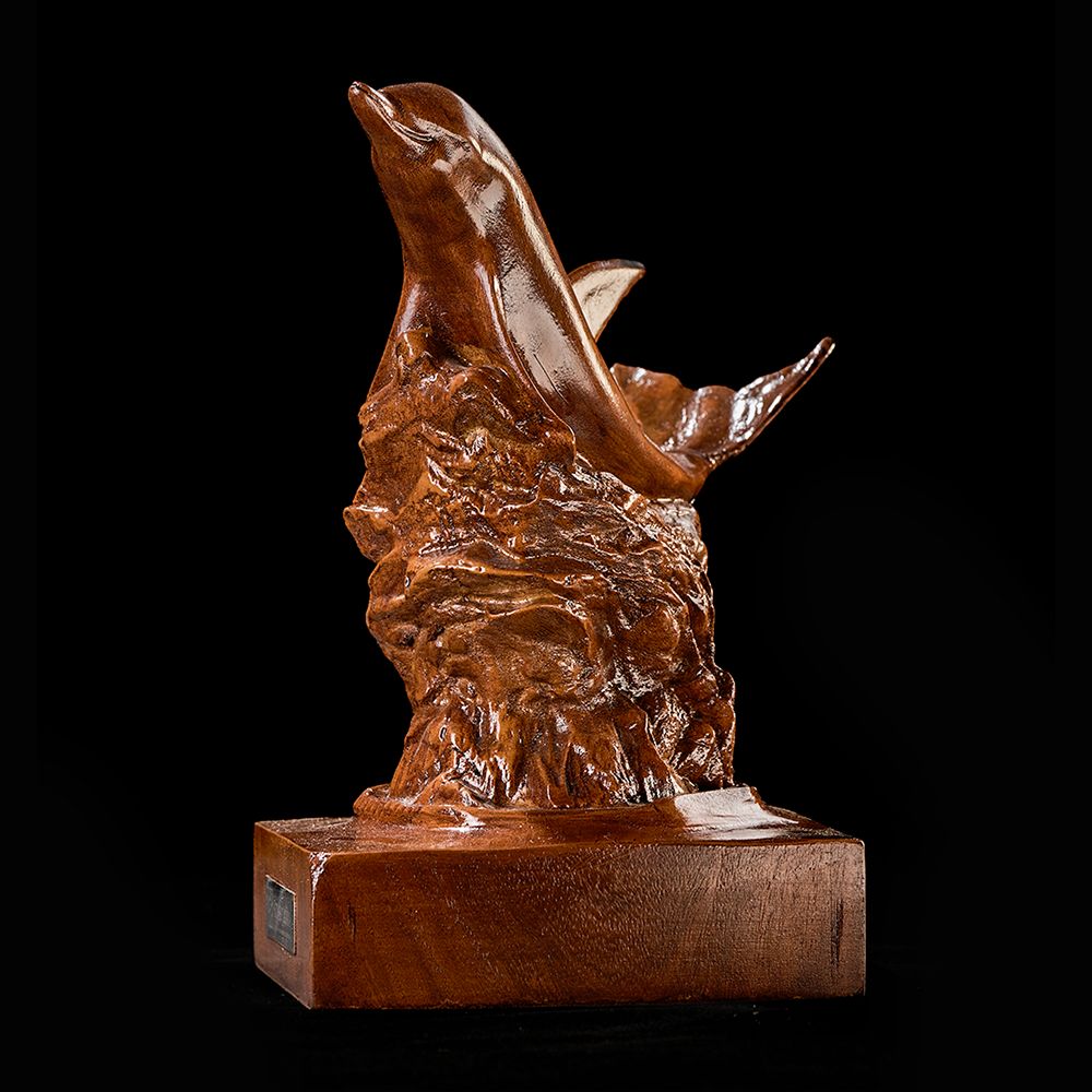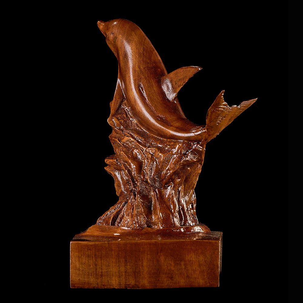A finely carved dolphin emerging from the waves. This Rosewood piece reflects vitality, freedom, and the boundless energy of the sea.