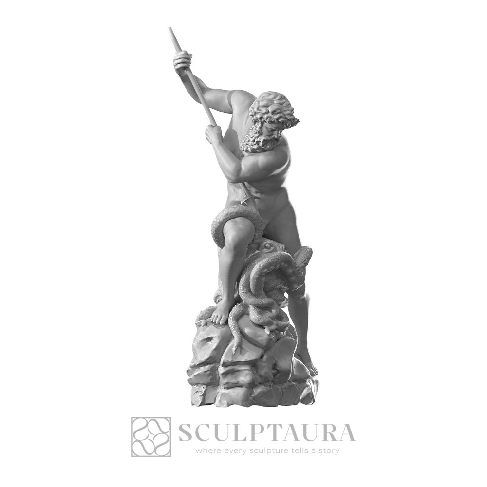 A magnificent, classical depiction of the sea god standing dynamically on a rocky outcrop. Masterfully realized to convey divine power and imposing strength.