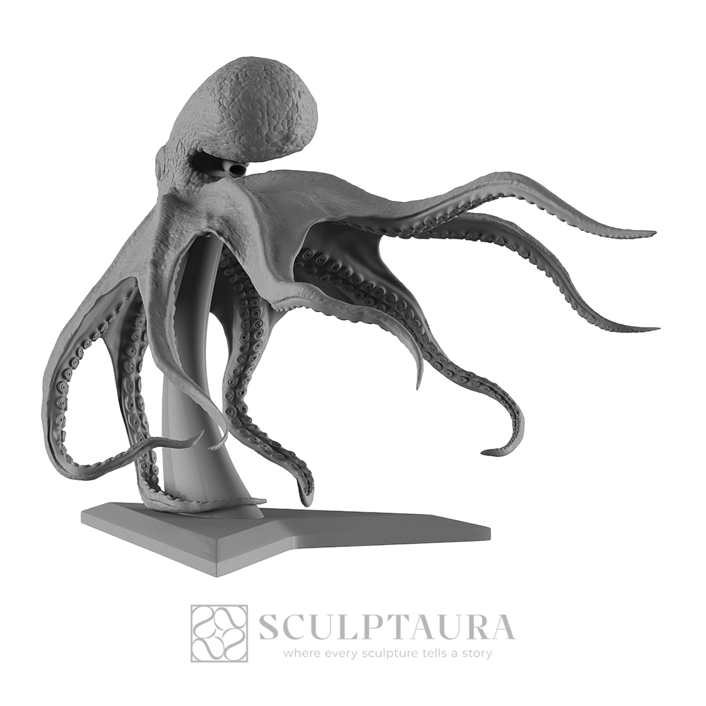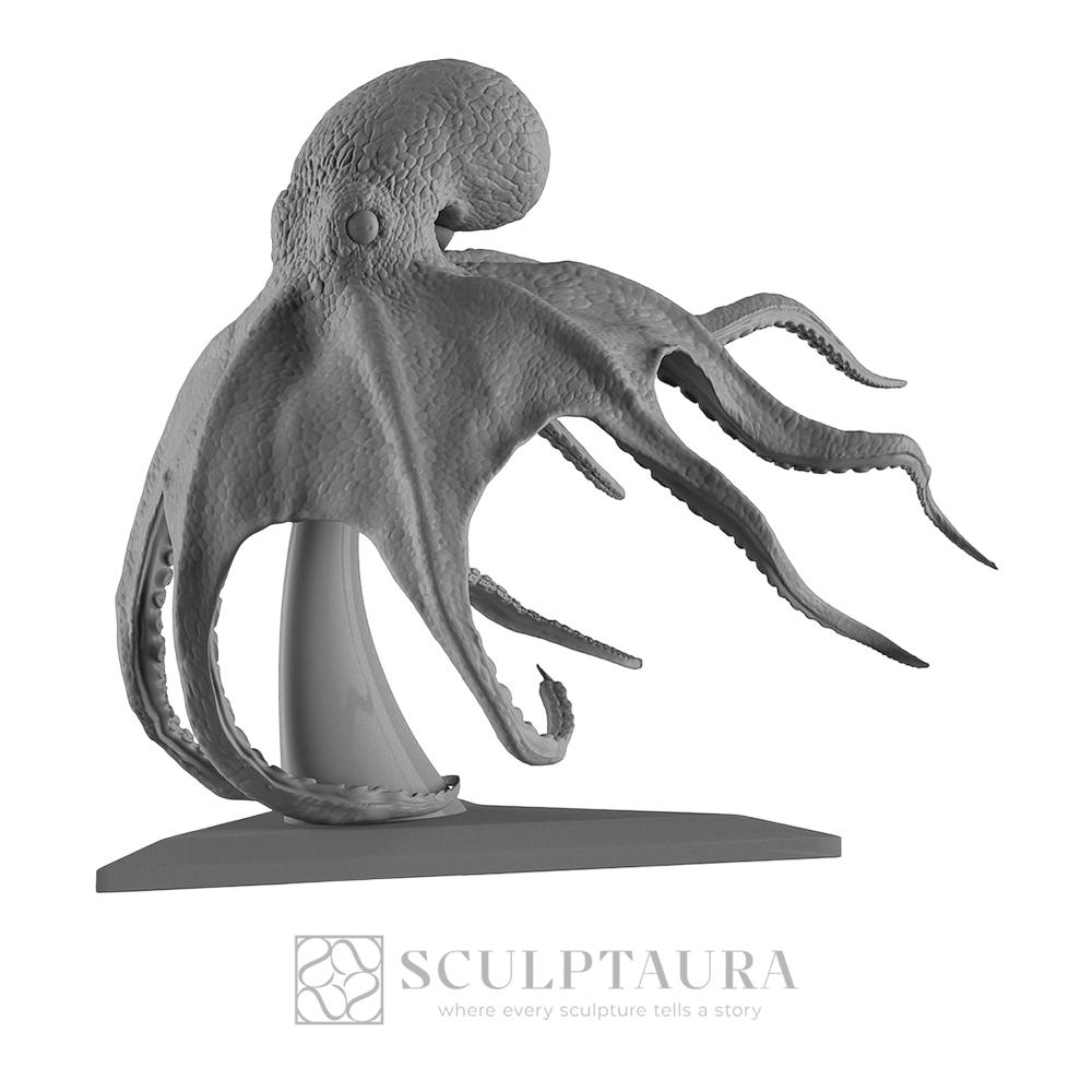 A dynamic, textured portrayal of a large octopus rising from the ocean floor. Masterfully realized to convey aquatic movement and striking predatory nature.