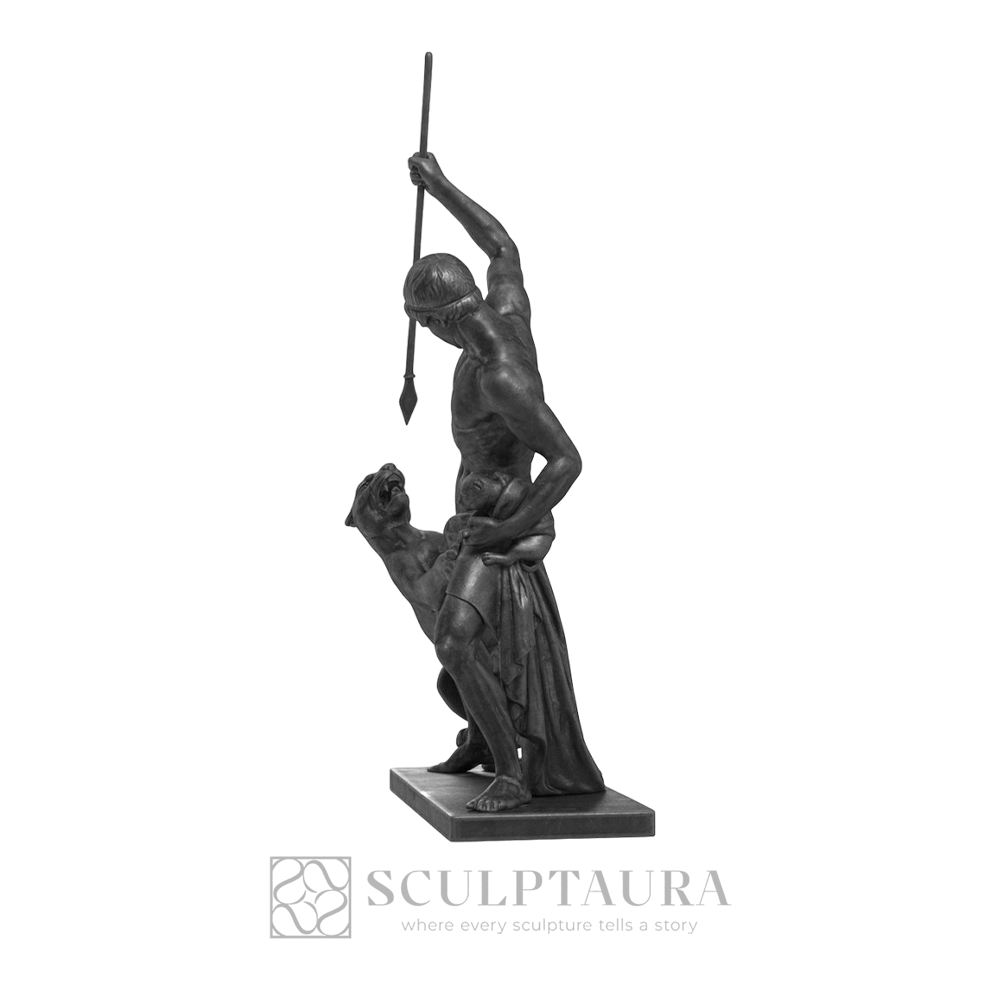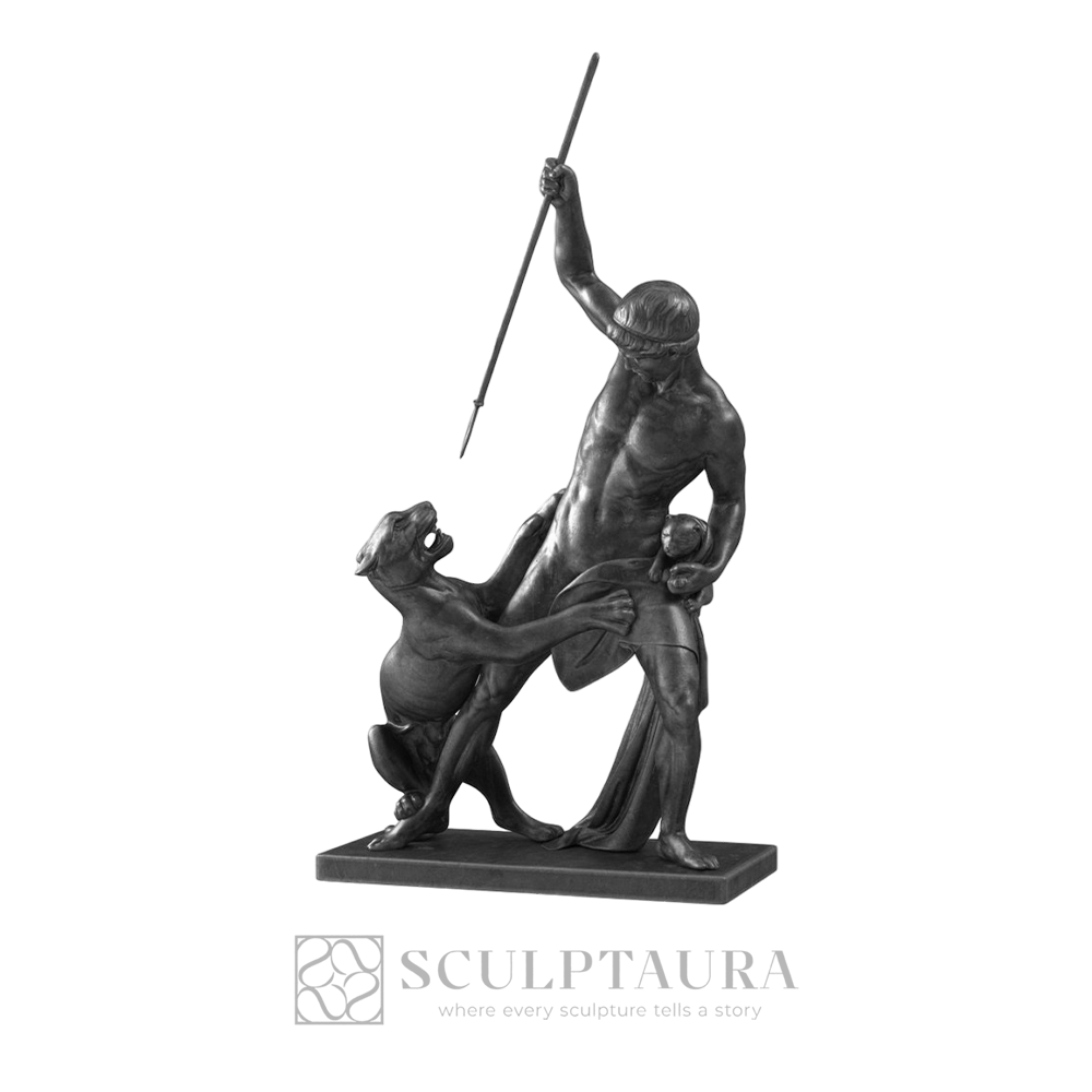 A magnificent, classical depiction of a powerful figure bracing for an attack with a large dog. Masterfully realized to convey raw power and courageous action.