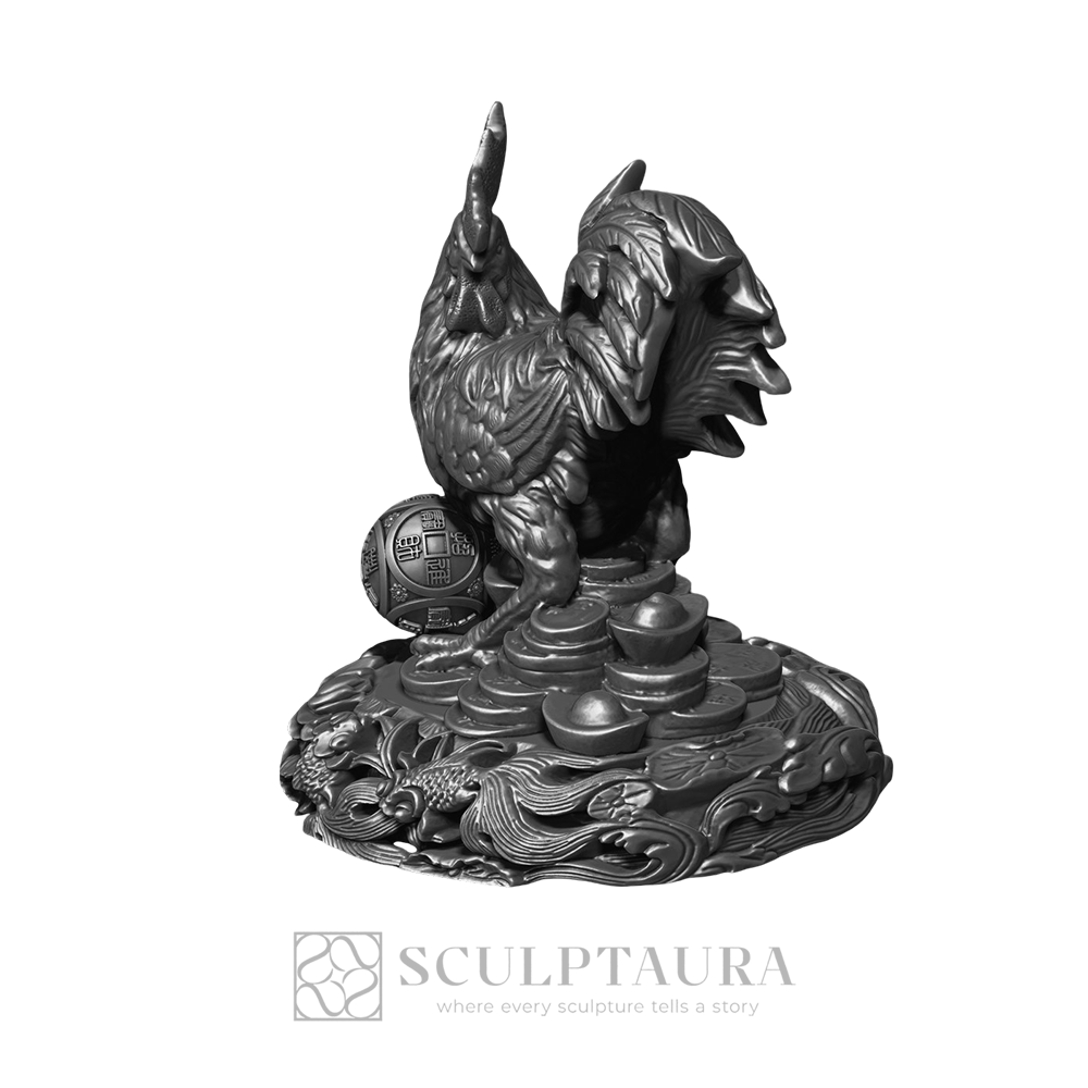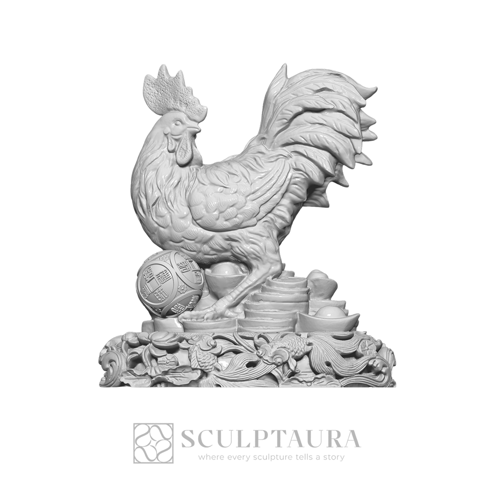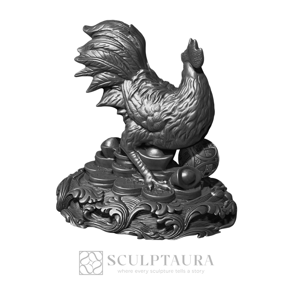 This exceptional cultural piece showcases the bird’s elaborate comb and tail feathers, resting on a richly carved base. Finely fashioned for patrons valuing prosperity and traditional symbolism.
