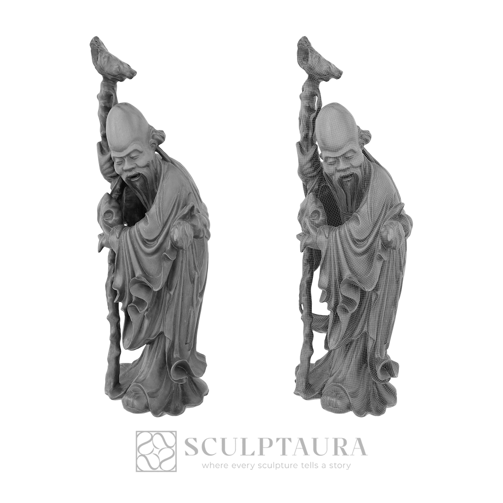 A highly detailed cultural figure of a revered old man, holding a gnarled walking stick. Masterfully realized to convey profound wisdom and serene form.