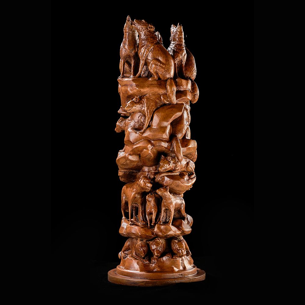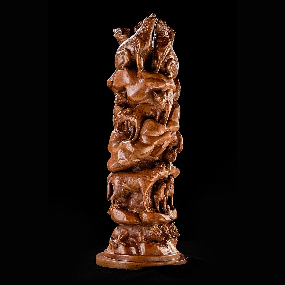 A remarkable carving uniting wolves, the beasts in one form. This piece celebrates the harmony of nature, strength of survival, and the chorus of the wild.